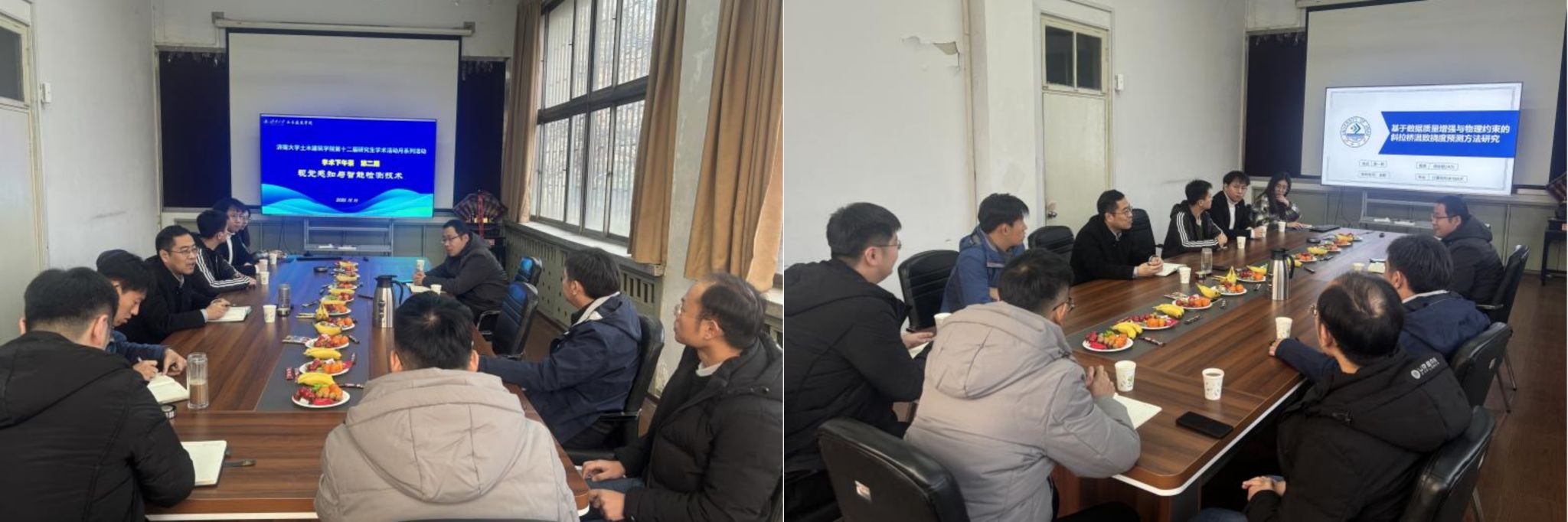 研究生陈一新做了题为《基于数据质量增强与物理约束的斜拉桥温致挠度预测方法研究》的报告,通过介绍目前国内公路桥梁的现状与存在的问题,体现了结构健康检测(SHM)的重要性,主要介绍了三个研究内容:基于改进ImDiffusion的监测数据异常检测方法、基于改进GAIN的缺失数据修复方法、基于物理温度特征的单点长时序温致挠度预测。详细的为大家讲解了目前结构检测研究的现状与难点。