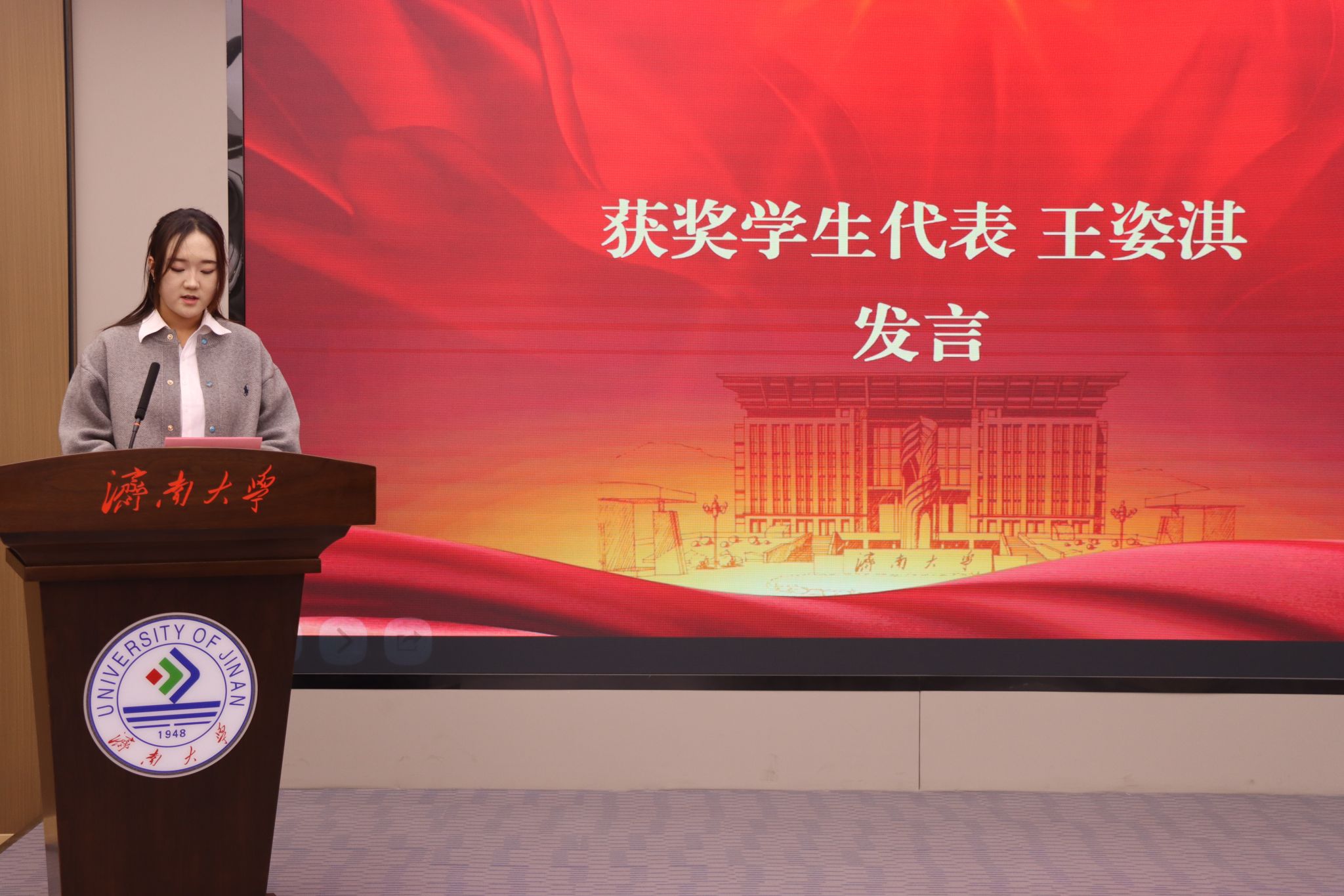 获奖学生代表王姿淇发言。她向济南四建集团致以诚挚谢意,坦言深受企业精神鼓舞,并号召全体同学常怀感恩之心,珍惜青春韶华,刻苦钻研学问,勇于担当使命,努力成长为可堪祖国建设重任的栋梁之材。