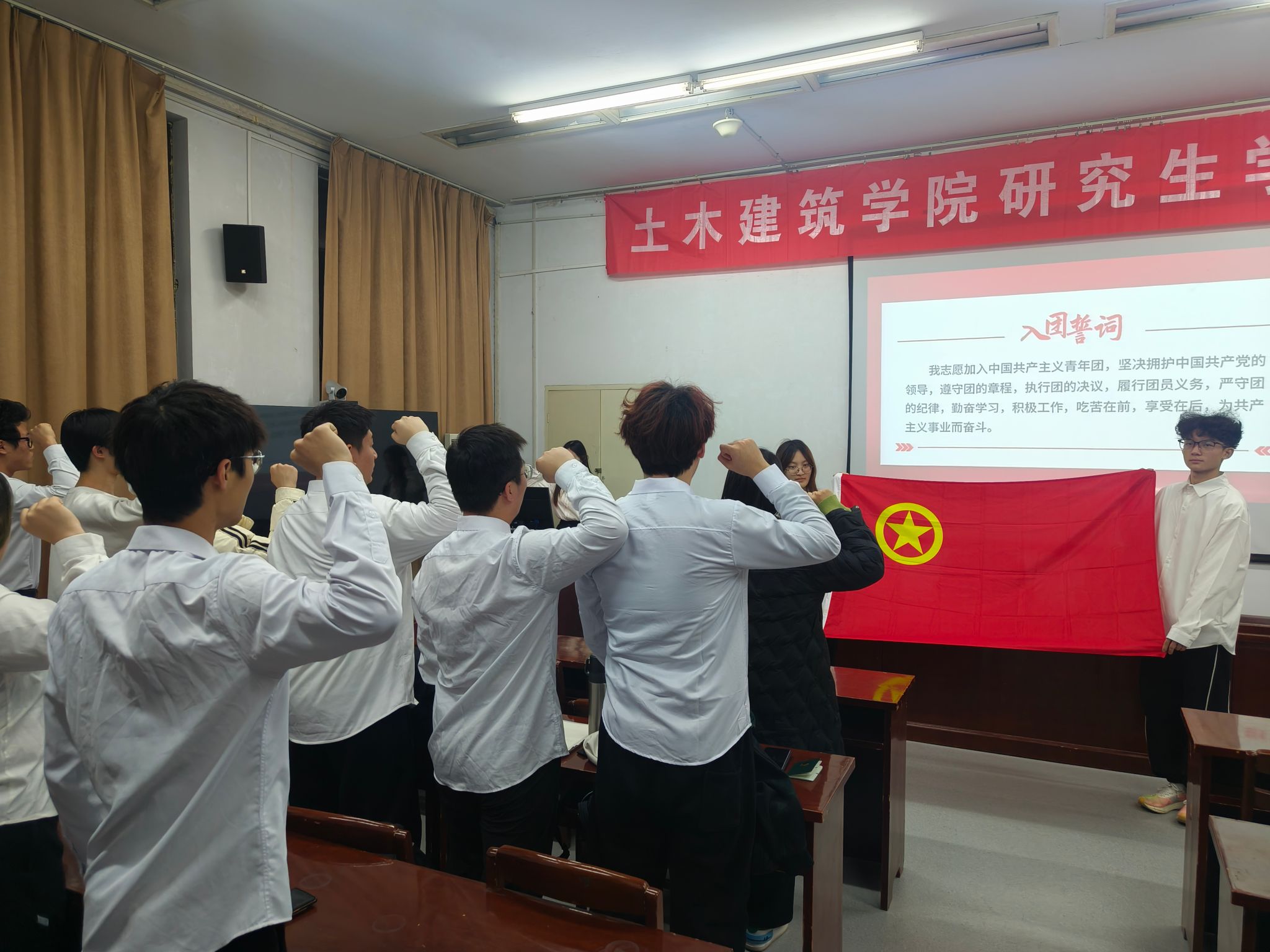 最后,全体同学再次起立,高唱团歌。歌声激昂,充满力量,标志着此次入团仪式的圆满结束。新团员的加入,不仅是我院团组织的壮大,更是青春力量的汇聚,团员们将秉持“团心永向党”的信念,在未来的日子里,以青春之智、青春之力、青春之勇,为祖国的繁荣昌盛贡献源源不断的青春力量,让青春在为党和人民的不懈奋斗中绽放绚丽之花。