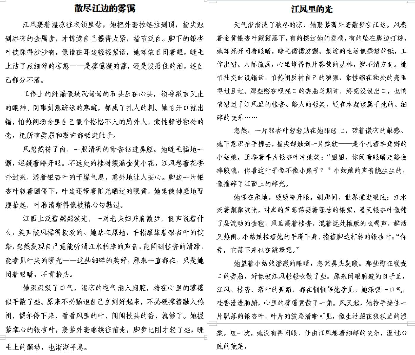 活动以一段意境深远的开放式故事为起点,要求参与者围绕主角在秋日江边陷入内心困境的场景展开合理且富有深度的续写。在为期一周的创作周期内,同学们踊跃投稿,不仅完成了情节的延续,更在提交时附上了简要的“续写核心思路”,阐明了对角色心理转变的深刻理解与希望传递的积极主题,展现了学院学子良好的文学素养与心理洞察力。经过学院心评审,最终从众多投稿中遴选出13份优秀作品。这些作品或聚焦于主角在自然中获取疗愈力量,或描绘其通过微小社交互动重拾人际信心,或书写其在自我对话中完成内心重建,主题多元,情感丰沛,叙事流畅,充分体现了同学们对心理健康议题的关注与思考,也生动传递了积极乐观、自我成长的疗愈理念。